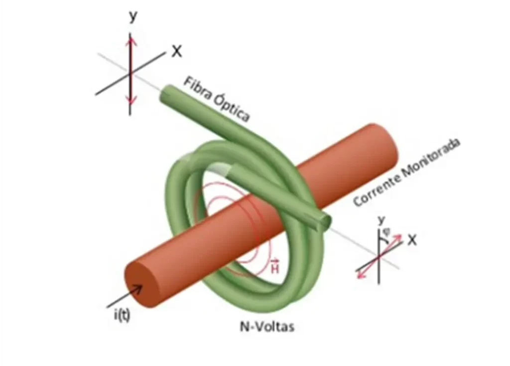 O Transformador Eletrônico de Corrente Óptico (TECO) opera com base no Efeito Faraday, um princípio físico que permite a medição de corrente elétrica de alta tensão sem contato direto. A tecnologia utiliza um sensor óptico que detecta o campo magnético gerado pela corrente, causando uma rotação no plano de polarização da luz que passa por ele. Essa rotação é medida e convertida em um valor digital preciso.